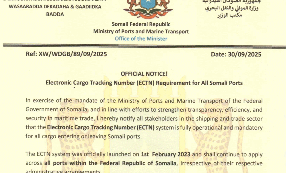 Dear All, Effective 14 October 2025, all containers arriving at the Port of Mogadishu must…