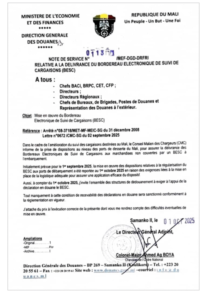 According to a recent notification from the Malian Customs Administration, the Electronic Cargo Tracking Note (ECTN) is a mandatory requirement for all shipments bound for Mali.